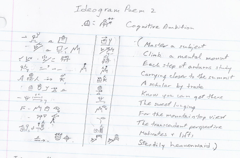 Maybe I should coin a new term for ideogram poems. “Icoems” (icon+poem). Author Dr. Joseph Suglia, ( of “Watchout” fame; Table 41 is his new novel) suggests “poeticographs”. Maybe, but maybe something shorter could be come up with. Any ideas?