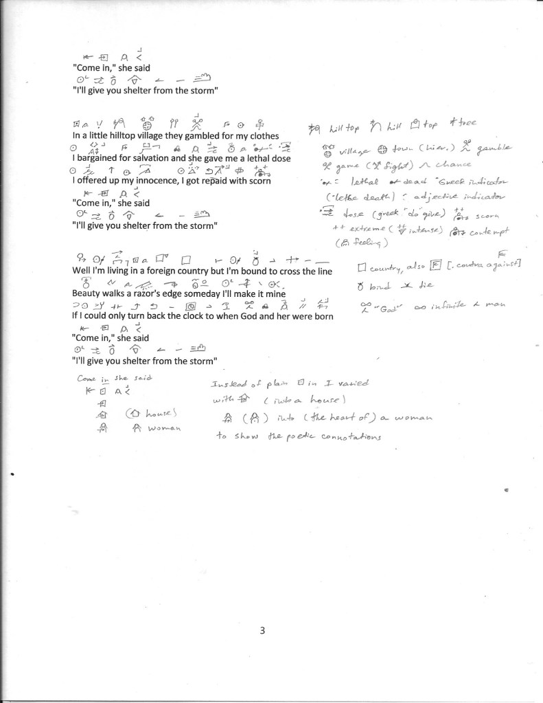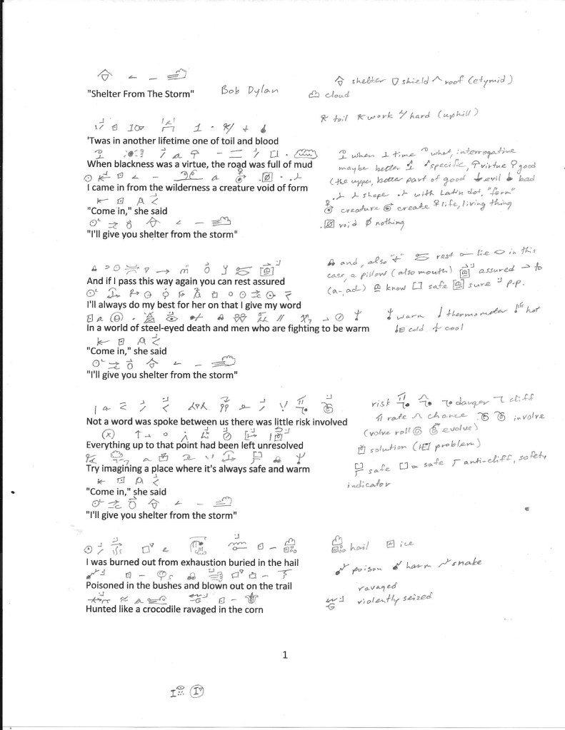 I’m not actually a fan of Bob Dylan or these lyrics but I transcribed the following for a “student” who wrote it out in ids using an old version of my id resource book. It was a fun exercise–for me working with ids is always rewarding.