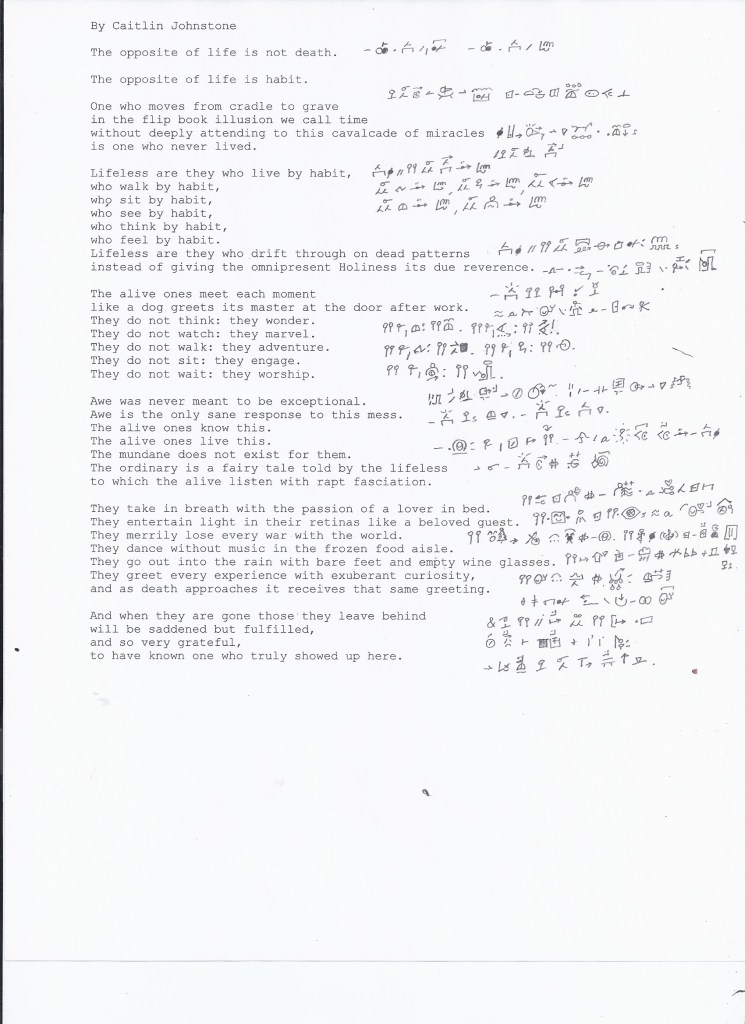 This poem reminds me of Goethe’s “Selige Sehnsucht”, which I transcribed into ids and made a post of a long time ago. But Johnstone is no Goethe. This poem caught my interest because of its characterization of habit as the “opposite of life”. I had been doing some ideographic thinking about “habit” recently. (My id for “habit” is explained in my recent post on “always”.) Habit is of course not the opposite of life, but a double-edged sword. Bad habits are a scourge and enemy, but good habits can be a tremendous tool and strength, consciously chosen, positive elements character, achievements that one works to establish. When I was in high school in the 60s I read a book by John Dewey that considered life in terms of habit.